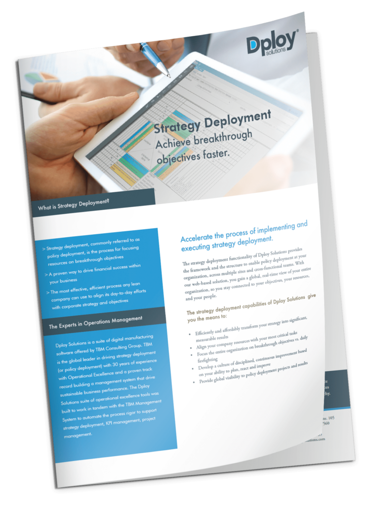 Dploy Solutions enhances strategy deployment transforming proven methods of the Hoshin Kanri System and the Toyota Production System, into digital tools that create a structured framework for cross-functional and multi-site policy alignment. Our platform ensures a real-time, global view of your organization, keeping objectives, resources, and teams interconnected and focused.