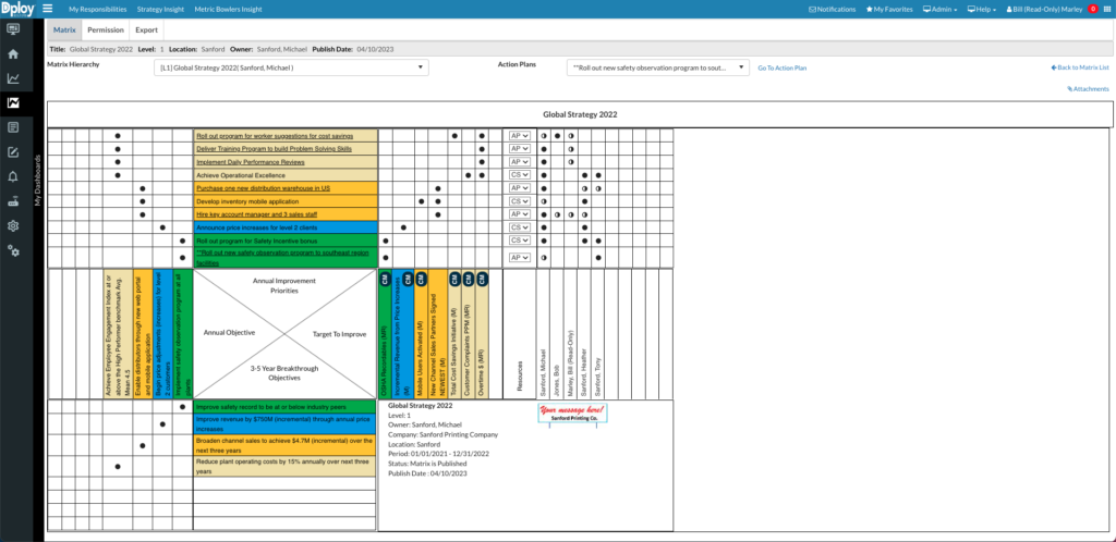 The platform transforms strategic planning and complex data into real-time, easy-to-understand dashboards (X-Matrix) and charts (Bowler, Gantt, Pareto, Spotlight and more), empowering you to make quick, data-driven decisions. Our seamless integration of data from various systems into a singular, accurate view means more insightful strategy execution. With Dploy Solutions, you gain access to critical insights, keeping you connected to your business objectives every hour of every day.
